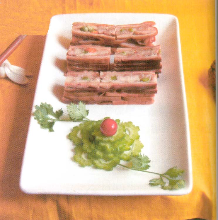 及以下步骤:加入处理好的蛋黄糕、蛋白高糕、玉兰片、胡萝卜、猪皮,拌匀腌制20分钟即可。 将缝好口的猪肚放入开水中焯水,并用竹签扎孔,以免猪肚爆掉。 将焯好水的猪肚放入卤汤锅中大火烧开小火卤制两个半小时。期间可以在猪肚上面扎孔。 将卤制好的猪肚制凉用平底盘子压上,顶上压上重物,然后再用保鲜裹上。 胡萝卜要求有同上的刀工处理。将猪肉切片:香料捻碎, 将猪肉加盐、味精、料酒、生抽、曲酒、香油、姜丝、葱条腌制。 加入处理好的蛋黄糕、蛋白高糕、玉兰片、胡萝卜、猪皮,拌匀腌制20分钟即可。 将缝好口的猪肚放入开水中焯水,并用竹签扎孔,以免猪肚爆掉。 将焯好水的猪肚放入卤汤锅中大火烧开小火卤制两个半小时。期间可以在猪肚上面扎孔。 将卤制好的猪肚制凉用平底盘子压上,顶上压上重物,然后再用保鲜裹上。