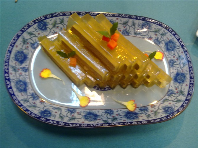 及以下步骤:将调制好的鱼胶粉倒入模子中,底层厚度为0.5毫米~0.8毫米,然后放入冰箱内冻一下,待凝固后取出。 将鸡肝压成1厘米厚的块放在凝固的鱼胶粉中间,然后注入鱼胶粉,放入冰箱 第二次放冰箱的温度和第一次放冰箱的温度应一致。,以免鱼胶粉分层。 将经过刀工初步处理的鸡肝泡进做好的汁中,浸泡最少12小时以上。 鱼胶粉:水=3:50,用开水加入鱼胶粉,加味精,鸡粉,盐调味,最低温度保持70℃。 隔水煮鸡肝,加味精、盐、鸡粉、少量的糖调味。 将煮好的鸡肝用刀推成泥,加入好的黄油(也可用纯牛奶代替),黄油:鸡肝=1:10拌匀。 将调制好的鱼胶粉倒入模子中,底层厚度为0.5毫米~0.8毫米,然后放入冰箱内冻一下,待凝固后取出。 将鸡肝压成1厘米厚的块放在凝固的鱼胶粉中间,然后注入鱼胶粉,放入冰箱 第二次放冰箱的温度和第一次放冰箱的温度应一致。,以免鱼胶粉分层。