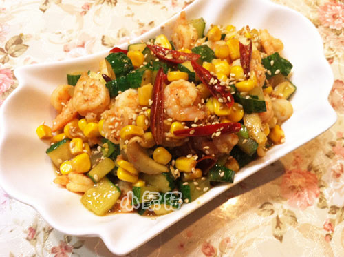 及以下步骤:先加入腌制好的虾仁炒变色捞出。 虾仁去虾线加入料酒、盐、胡椒腌制15分钟,黄瓜切丁、玉米粒洗净,葱姜蒜红辣椒切好备用。 先加入腌制好的虾仁炒变色捞出。 虾仁去虾线加入料酒、盐、胡椒腌制15分钟,黄瓜切丁、玉米粒洗净,葱姜蒜红辣椒切好备用。 先加入腌制好的虾仁炒变色捞出。 虾仁去虾线加入料酒、盐、胡椒腌制15分钟,黄瓜切丁、玉米粒洗净,葱姜蒜红辣椒切好备用。 先加入腌制好的虾仁炒变色捞出。 放入黄瓜丁和玉米粒稍微加点热水炒一下。 再把之前炒熟的虾仁倒进去一起翻炒,加入老抽、生抽、盐、胡椒、鸡精、少许白糖调味即可出锅。 装盘后撒上熟的白芝麻,即可食用,非常好吃。