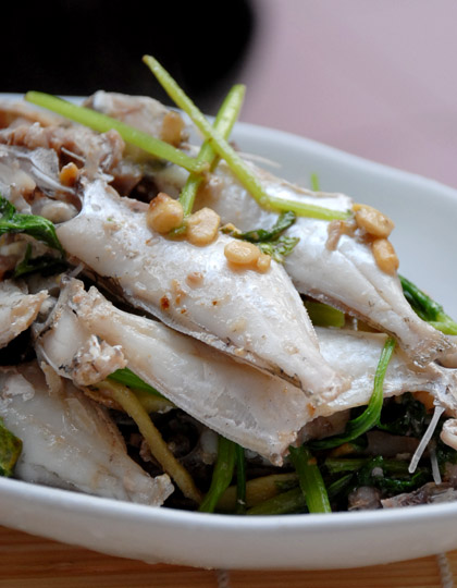 1、鹿仔鱼撕去外皮(让卖鱼的帮忙),洗净后用少量的盐抓一下。