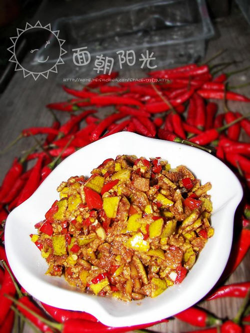 及以下步骤:桔子皮用水煮一下,然后出锅用冷水漂一天。 桔子皮切成小丁。 桔子皮用水煮一下,然后出锅用冷水漂一天。 桔子皮切成小丁。 桔子皮用水煮一下,然后出锅用冷水漂一天。 桔子皮切成小丁。 热锅冷油,下剁椒炒出辣味。 下桔子皮炒。 调入适量生抽。 调入少量盐和适量味精。