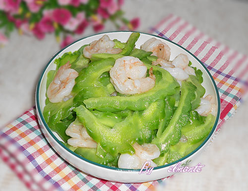 及以下步骤:放盐,糖翻炒一会即可。 苦瓜对半切开,去籽和瓤,然后切薄片。 虾仁解冻,用料酒,太白粉和少许油腌10分钟。 苦瓜对半切开,去籽和瓤,然后切薄片。 虾仁解冻,用料酒,太白粉和少许油腌10分钟。 锅放水烧开,把苦瓜汆烫至断生。 捞起过凉水,以保持青绿。 热油锅,把虾仁炒至微微变色,卷起。 把苦瓜放入炒匀。 放盐,糖翻炒一会即可。