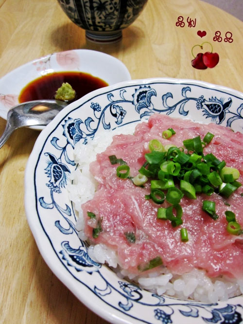 及以下步骤:放入一半的香葱末儿,继续剁。 加入一匙净水,将鱼蓉剁匀后放小碗中备用。 取做好的米饭一碗,加入寿司醋一勺。 将鲔鱼蓉放在米饭上。 将剩余的香葱撒在鱼蓉上做装饰。 将芥末与酱油调匀,拌入饭中即可。 取做好的米饭一碗,加入寿司醋一勺。 将鲔鱼蓉放在米饭上。 将剩余的香葱撒在鱼蓉上做装饰。 将芥末与酱油调匀,拌入饭中即可。