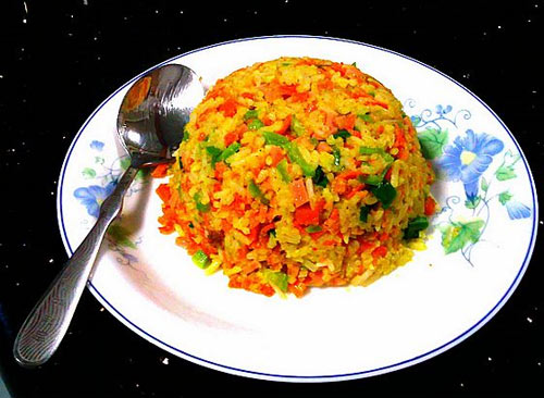 及以下步骤:再放入青椒丁、火腿丁、豆芽丁翻炒均匀。 最后放入小葱提香、少量食盐炒匀即可。 装盘即可开吃 先把米饭搅松,倒入打散的鸡蛋液,下入一小勺咖喱粉,全部搅均匀。 锅底洗净烧热,下入适量油。 放入胡萝卜翻炒,炒制油变红。 放入拌好的米饭,中火翻炒,由于米饭里面有蛋液,所以会有点点沾锅,没关系,炒干后就不会沾锅了。 再放入青椒丁、火腿丁、豆芽丁翻炒均匀。 最后放入小葱提香、少量食盐炒匀即可。 装盘即可开吃