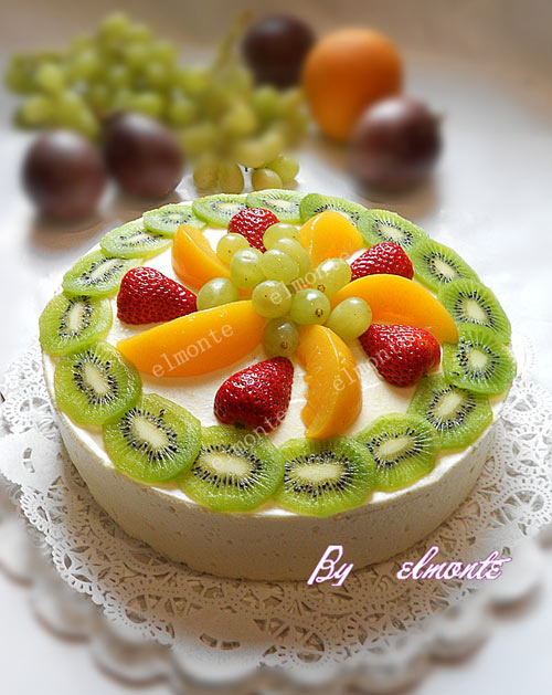 糖(3大匙+1/4杯+92克) / 醋(几滴) / 低筋面粉(1/2杯) / 水(27克) / 蜂蜜(3大匙) / 草莓(3个) / 鲜奶油(350ml) / 玉米油(1/4杯(60ml)) / 蛋白(8个) / 吉利丁粉(1小包(7克)) / 奇异果(2个) / 葡萄(适量) / 罐头黄桃(1罐) / 鲜百香果汁(185ml)