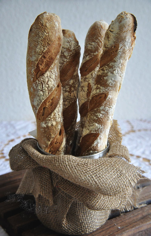 及以下步骤:用手掌心,从中间使力,将尖的橄榄球形小心地搓长,成baguette形状。取干净的厨房布,撒足面粉,将做好的baguette面团放再上面,每两个baguette中间,摺起些布来隔开。搭上塑料袋,松弛45分钟。 将baguette顺着布滚到烘焙纸上。搭上塑料袋,继续松弛30-45分钟。烤箱预热到220度。baguette表面划开3-4道,约45度角。烤箱预热好后,先喷水,然后推入面包。220度烤10分钟,然后转180度烤25分钟,即可。 酵母准备:将1/4干酵母溶入温水种,搅拌均匀。 天然酵母种:将高筋面粉与温水先混合均匀。然后加入天然酵母和80 ml步骤1里做好的酵母溶液。混合均匀。盖上盖,静置8小时。 poolish种:取1茶勺步骤1里的酵母溶液,与温水、面粉混合均匀。盖上塑料袋,同样静置8小时。 8小时后的天然酵母种。充满气泡,体积明显增大,有酸味。8小时后的poolish种。体积明显增大,有气孔,有酸味。 面包部分:用料理机,将高筋面粉、黑麦面粉、温水先粗略混合。然后加入做好的天然酵母种和poolish种,先低速混合,然后高速约5分钟,直到面团变得非常光滑。最后加入盐,继续高速搅拌2-3分钟。将面团取出,放入面盆。发酵3小时。在第20,40和60分钟时,取出,折两次三摺,然后再放回面盆。用塑料袋轻轻搭在面盆上。图为3小时后面团的形态 将面团分成5个约200 g的面团,或者4个200 g加两个100 g。200 g的做baguette,100 g的做面包。每个面团都单独再折两次三摺。表面撒上些面粉,轻轻搭上塑料袋,松弛半小时。取一块面团,按baguette的塑型方法做成细的橄榄球形。 用手掌心,从中间使力,将尖的橄榄球形小心地搓长,成baguette形状。取干净的厨房布,撒足面粉,将做好的baguette面团放再上面,每两个baguette中间,摺起些布来隔开。搭上塑料袋,松弛45分钟。 将baguette顺着布滚到烘焙纸上。搭上塑料袋,继续松弛30-45分钟。烤箱预热到220度。baguette表面划开3-4道,约45度角。烤箱预热好后,先喷水,然后推入面包。220度烤10分钟,然后转180度烤25分钟,即可。