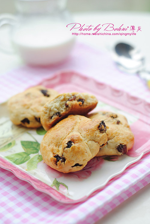 及以下步骤:包上保鲜膜后放入冰箱内放置约1小时(这一步是保证司康口感外焦里嫩的关键)。 从冰箱中取出后,随意搓成圆形。 铺放在烤盘中,刷蛋液或者牛奶液。 预热200度的烤箱,烤约20分钟左右即可。 用手将面粉和黄油搓成颗粒状,再加入葡萄干和牛奶。 用手揉匀即可,注意不要搅拌过度。 包上保鲜膜后放入冰箱内放置约1小时(这一步是保证司康口感外焦里嫩的关键)。 从冰箱中取出后,随意搓成圆形。 铺放在烤盘中,刷蛋液或者牛奶液。 预热200度的烤箱,烤约20分钟左右即可。