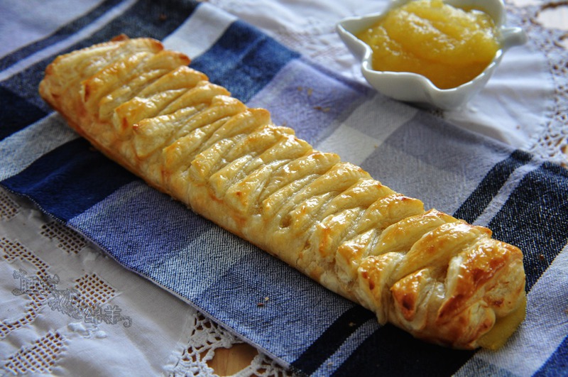 4、用刀,按图7,在左右留出的1/3的面皮上,朝着自己的方向,将面皮斜划开来。这个宽度的面皮,划的宽度在1 cm左右。左右交叉着将中间1/3涂有苹果酱的面皮包起来。最后表面刷上蛋液,放入预热好的烤箱,180度,20分钟,即可。