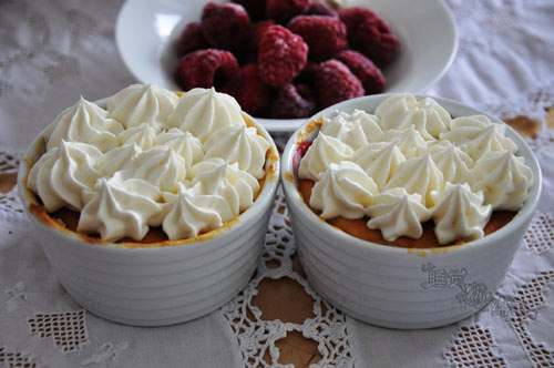 为t做回国前的最后一款蛋糕。因为t是吃点心当早餐的。 这样,爸爸下午过来吃一份,t还可以有两个早上能吃到我为他做的早餐。 用的覆盆子,乳酪蛋糕。 这回不用底,直接放在杯子里烤,用勺子舀着吃。配上鲜奶油,非常舒服。