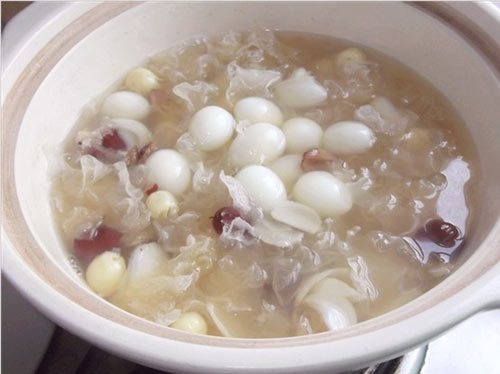 清心润肺、益气安神,很滋润养颜的一道甜品,适宜熬夜后的干咳、失眠、心烦。 对肺燥引起的咳嗽,特别是对那些无痰干核、喉头发痒的患者更为有益。 雪耳含有较丰富的蛋白质,所谓的平民燕窝。 材料:鲜莲子150克(干莲子20克),鲜百合2个(干百合20克),雪耳1朵,红枣8粒,冰糖适量,鹌鹑蛋20个(可不用) 黄冰糖比白色的冰糖更好。