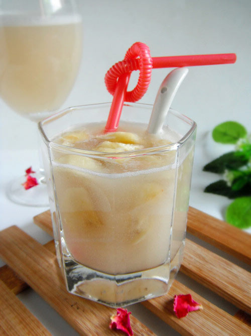 及以下步骤:香蕉去皮切成异形小块。 加入榨好的果汁中。 调入适量蜂蜜拌匀,即可食用。 白梨去皮去核切成小块。 把苹果和梨依次倒入料理机内。 加入凉开水。 搅拌成汁。 香蕉去皮切成异形小块。 加入榨好的果汁中。 调入适量蜂蜜拌匀,即可食用。