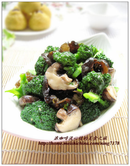 及以下步骤:用水淀粉勾芡即可。 西兰花洗净,掰成小块,放入开水锅中焯一下捞出。香菇洗净切片。 炒锅倒油烧热,下葱姜末炝锅。 西兰花洗净,掰成小块,放入开水锅中焯一下捞出。香菇洗净切片。 炒锅倒油烧热,下葱姜末炝锅。 倒入香菇略炒。 再倒入西兰花和木耳炒匀。 加入适量鸡汤、鲍鱼汁、盐、糖、鸡精炒匀。 用水淀粉勾芡即可。 用水淀粉勾芡即可。