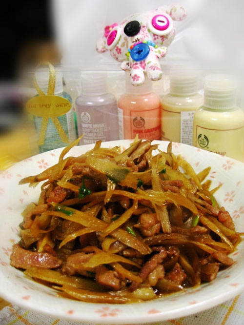 4、将牛蒡和牛肉翻炒均匀,多炒一下,尽量炒干水分。