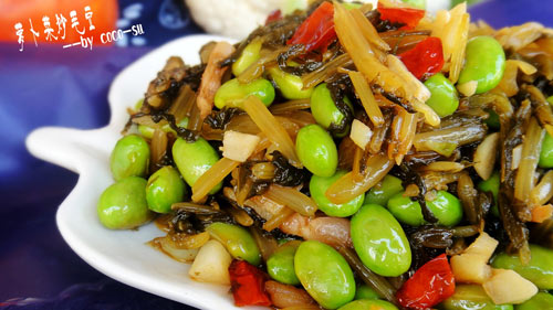 及以下步骤:倒入毛豆一起翻炒片刻。 依次加入白糖少许。 加入适量的盐。 最后加入少许蔬之鲜调味即可。 锅热注虾油,倒入姜蒜末和干红辣椒爆香。 倒入腌萝卜菜翻炒片刻至萝卜菜水份蒸发。 倒入毛豆一起翻炒片刻。 依次加入白糖少许。 加入适量的盐。 最后加入少许蔬之鲜调味即可。