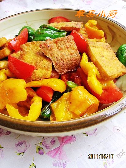 及以下步骤:豆腐切成薄块,用盐腌制二十分钟左右,下油锅煎至两面黄脆盛出。 将绿椒、黄椒手掰成块,西红柿切成小块。 豆腐切成薄块,用盐腌制二十分钟左右,下油锅煎至两面黄脆盛出。 将绿椒、黄椒手掰成块,西红柿切成小块。 豆腐切成薄块,用盐腌制二十分钟左右,下油锅煎至两面黄脆盛出。 将绿椒、黄椒手掰成块,西红柿切成小块。 豆腐切成薄块,用盐腌制二十分钟左右,下油锅煎至两面黄脆盛出。 锅中放少许油,放绿椒和黄椒加少许盐翻炒。 倒入煎好的豆腐翻炒一下。 倒入西红柿快速翻炒,放少许鸡精出锅。