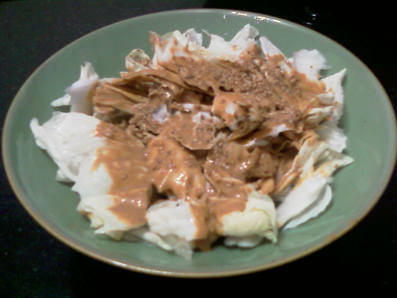 及以下步骤:芝麻酱加温水和稀,加入适量的白醋,盐和糖,再加入少量的鸡精和香油和匀。 大白菜斜刀切片(菜心最佳)。 芝麻酱加温水和稀,加入适量的白醋,盐和糖,再加入少量的鸡精和香油和匀。 大白菜斜刀切片(菜心最佳)。 芝麻酱加温水和稀,加入适量的白醋,盐和糖,再加入少量的鸡精和香油和匀。 大白菜斜刀切片(菜心最佳)。 芝麻酱加温水和稀,加入适量的白醋,盐和糖,再加入少量的鸡精和香油和匀。 大白菜斜刀切片(菜心最佳)。 芝麻酱加温水和稀,加入适量的白醋,盐和糖,再加入少量的鸡精和香油和匀。 准备吃的时候淋在切好的白菜上,再撒上黑芝麻,拌匀。
