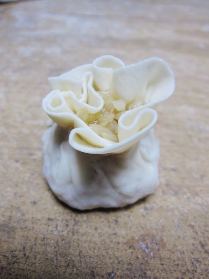 烧卖皮周边要擀薄一点,因为捏紧后,会厚实一点。