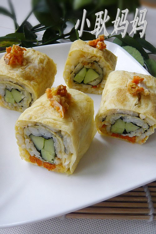 及以下步骤:处理好的蟹肉加入米饭里面。 加入白醋,白糖,盐调成的汁拌匀。 先把蛋皮铺在寿司帘上。 铺上一层米饭。 再在上面铺上一张紫菜。 放上黄瓜条。 卷起来包紧。 切成小段。 再在上面点缀点蟹黄就可以。 再在上面点缀点蟹黄就可以。