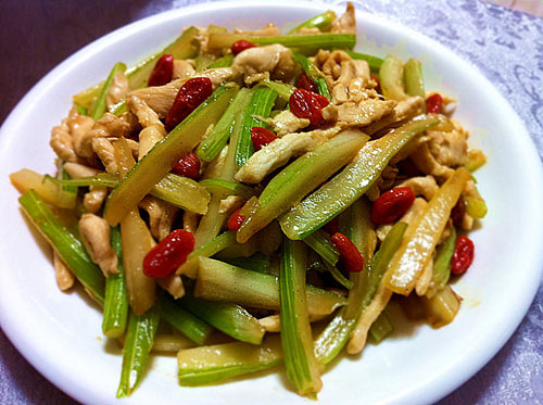 5、当西芹炒到8成熟时倒入鸡丝,一起煸炒。出锅前加入枸杞和适量盐和味精即可。