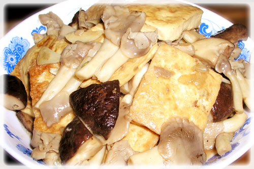 及以下步骤:加入葱蒜豆腐翻炒均匀,倒入调料炒匀 至汤汁变浓稠即可。 秀珍菇清洗干净,稍大一些的撕成小朵,沥干水分。 香菇清洗干净,每朵切成4瓣,沥干水分。 秀珍菇清洗干净,稍大一些的撕成小朵,沥干水分。 香菇清洗干净,每朵切成4瓣,沥干水分。 豆腐洗净切成4厘米见方1厘米厚的片备用。 取一个碗加入蚝油、酱油、白砂糖、盐、白胡椒粉,少量清水调匀。 平底锅加热倒入少许油,小心将豆腐片放入锅里煎至两面金黄盛出。 将香菇、秀珍菇倒入锅里翻炒(可以少加水),至蘑菇稍软。 加入葱蒜豆腐翻炒均匀,倒入调料炒匀 至汤汁变浓稠即可。