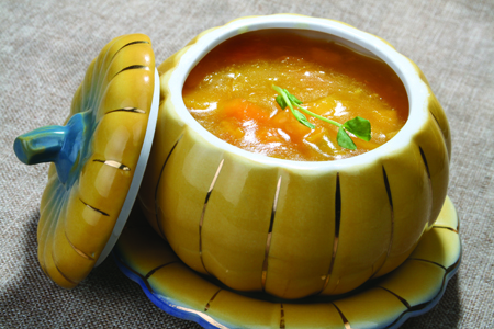 金南瓜蒸熟打成溶浆,留一部分切成菱形块,加入百合调味即可。