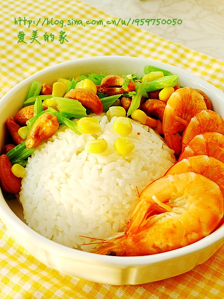 及以下步骤:加入腰果拌匀出锅。 盘中装米饭,摆入西芹腰果及虾即可。 准备材料:虾洗净,芹菜摘洗干净后切小段。 将芹菜段放入开水中焯烫,捞出后立即放入凉水中。 将玉米粒放入开水中焯烫。 虾放入加盐加姜片的开水中煮熟捞出。 锅中加油烧热后,中小火将腰果炸至金黄控油捞出。 锅内留底油放入玉米粒和芹菜段,加入盐,鸡精,快速翻炒。 加入腰果拌匀出锅。 盘中装米饭,摆入西芹腰果及虾即可。