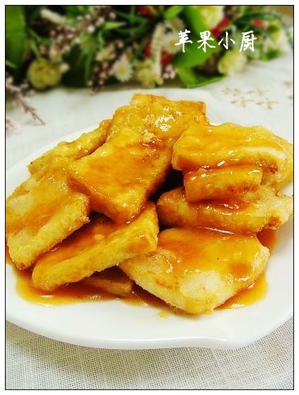 刚炸出锅的腐,裹着酥脆的外壳,浇上一层酸甜的茄汁,咬一口,外焦里嫩,相当美味。