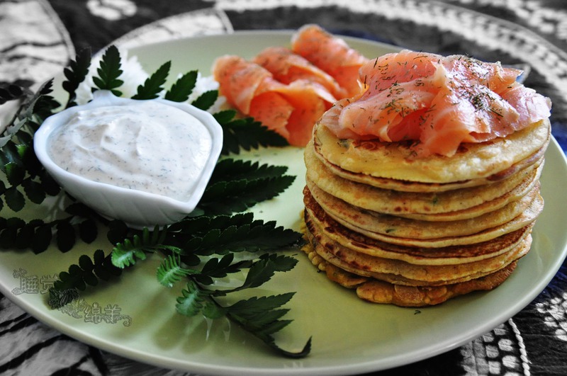 及以下步骤:香葱切细圈,胡萝卜擦成非常细、近似泥的形状。将煎饼部分所有材料混合均匀。静置15分钟。 小煎锅刷上油,大约2勺一张,可以煎10张。每煎一张之前锅里都用刷子刷上油。煎好的煎饼放在温热的烤箱里保温。具体煎多少时间,要看各家的炉子、锅、做多大。两面都焦黄了,就可以了。 香葱切细圈,胡萝卜擦成非常细、近似泥的形状。将煎饼部分所有材料混合均匀。静置15分钟。 小煎锅刷上油,大约2勺一张,可以煎10张。每煎一张之前锅里都用刷子刷上油。煎好的煎饼放在温热的烤箱里保温。具体煎多少时间,要看各家的炉子、锅、做多大。两面都焦黄了,就可以了。 香葱切细圈,胡萝卜擦成非常细、近似泥的形状。将煎饼部分所有材料混合均匀。静置15分钟。 小煎锅刷上油,大约2勺一张,可以煎10张。每煎一张之前锅里都用刷子刷上油。煎好的煎饼放在温热的烤箱里保温。具体煎多少时间,要看各家的炉子、锅、做多大。两面都焦黄了,就可以了。 香葱切细圈,胡萝卜擦成非常细、近似泥的形状。将煎饼部分所有材料混合均匀。静置15分钟。 小煎锅刷上油,大约2勺一张,可以煎10张。每煎一张之前锅里都用刷子刷上油。煎好的煎饼放在温热的烤箱里保温。具体煎多少时间,要看各家的炉子、锅、做多大。两面都焦黄了,就可以了。 将莳萝crème fraîche酱里所有材料混合均匀,尝味道。 我喜欢取张煎饼,抹上酱,然后铺块熏三文鱼,最后铺些蔬菜(今天用的是红甜椒炒大白菜),两侧捏起来吃o(∩_∩)o~