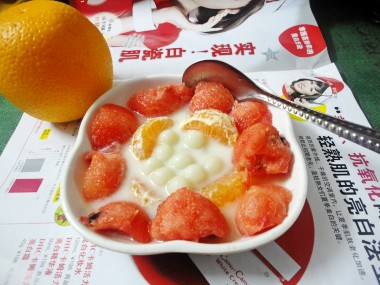 及以下步骤:倒入凉的牛奶。 把糯米粉揉成团。 把团揉成长条,切成均匀小段。 把糯米粉揉成团。 把团揉成长条,切成均匀小段。 揉成小丸子。 烧开水下锅煮3分钟,放凉。 把西瓜,橘子摆在碟子里。 把放凉的小丸子放在中间。 倒入凉的牛奶。