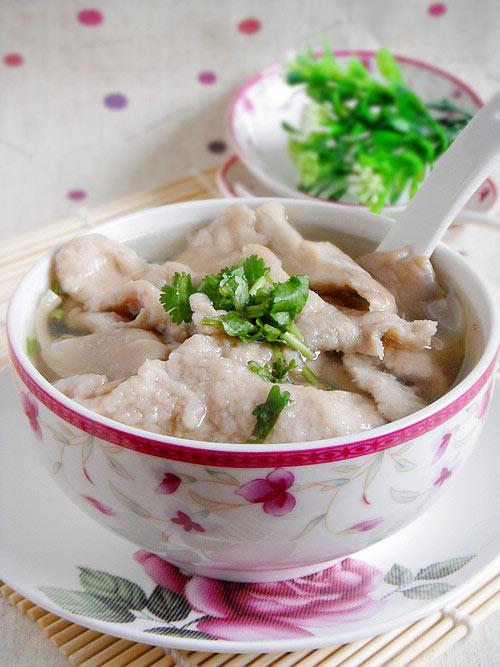 猪瘦肉的营养非常全面,不仅为人体提供优质蛋白质和必需的脂肪酸,还提供钙、磷、铁、硫胺素、核黄素和尼克酸等营养元素。相对牛羊肉来说,猪瘦肉的营养优势在于含有丰富的b族维生素,能调节新陈代谢,维持皮肤和肌肉的健康,增强免疫系统和神经系统的功能,促进细胞生长和分裂,预防贫血发生。有补体强身,滋阴润燥、丰肌泽肤的功效。 清水肉片,是闽南地区的传统做法,口感和味道都很好,肉片嫩嫩滑滑,入口即化,汤却清清爽爽,不油不腻,不浑浊。此汤做法简单,营养丰富,清请淡淡,不但适合孩子和老人,也特别适合做为病后初愈的饮食。
