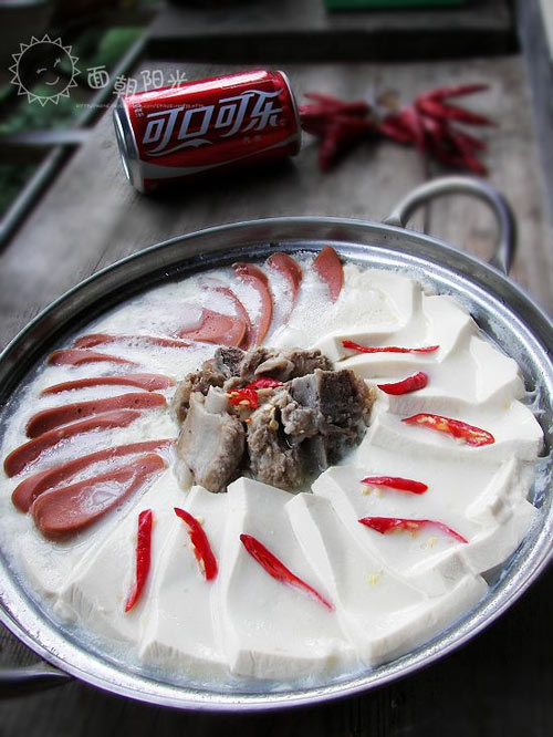 及以下步骤:准备好所有材料,黄豆用水泡12小时。 将豆腐、南瓜、火腿肠切片,排骨煮熟,所有材料码入锅中。 准备好所有材料,黄豆用水泡12小时。 将豆腐、南瓜、火腿肠切片,排骨煮熟,所有材料码入锅中。 准备好所有材料,黄豆用水泡12小时。 将豆腐、南瓜、火腿肠切片,排骨煮熟,所有材料码入锅中。 将黄豆加水磨成豆浆。 豆浆过滤掉豆渣,倒入码好食材的锅中。 将锅置火上调入油、盐、少量味精。 待锅内煮开,将锅移至酒精炉上点火边炖边吃。