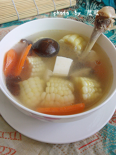及以下步骤:锅内加冷水把鸡腿骨放入烧。 烧至有血沫烧出即可关火,捞出冲洗干净。 锅内加入姜片和鸡腿骨,倒入凉水,再加入1茶勺料酒和半茶勺醋,盖上盖开始煲。 锅内水开后,加入玉米块后继续煲。玉米煮出香味后把香菇和胡萝卜片放入一起煲3分钟左右。 最后关火,把内脂豆腐放入,加入小勺盐调味,滴几滴香油即可。 很适合口味比较淡的朋友喝呢! 锅内加入姜片和鸡腿骨,倒入凉水,再加入1茶勺料酒和半茶勺醋,盖上盖开始煲。 锅内水开后,加入玉米块后继续煲。玉米煮出香味后把香菇和胡萝卜片放入一起煲3分钟左右。 最后关火,把内脂豆腐放入,加入小勺盐调味,滴几滴香油即可。 很适合口味比较淡的朋友喝呢!