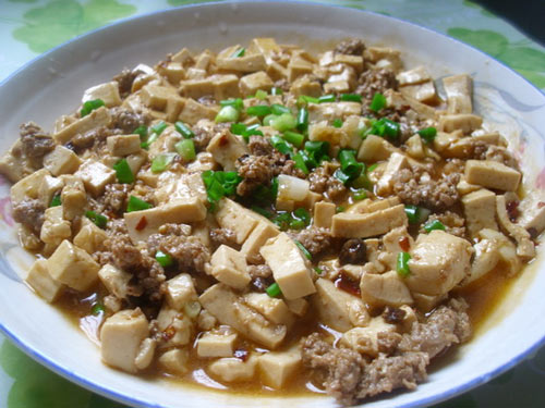及以下步骤:加入半勺盐,半勺味精,一大勺酱油,一小勺辣椒油,加适量水,加盖烧。 烧至水快干时,撒葱花即可。 牛肉洗净剁成肉末,豆腐切丁。 葱花备用(拌海带丝剩下一点点)。 蒜蓉备用(拌海带丝剩下一点点)。 锅里热油,炒香蒜蓉。 加入牛肉末翻炒至变白,再加入豆腐丁翻炒。(火太大,来不及拍成两个步骤) 加入一勺老干妈翻炒。 加入半勺盐,半勺味精,一大勺酱油,一小勺辣椒油,加适量水,加盖烧。 烧至水快干时,撒葱花即可。