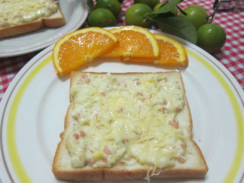 7、吐司放进烤箱烤至微金黄色,涂上一层沙拉酱。