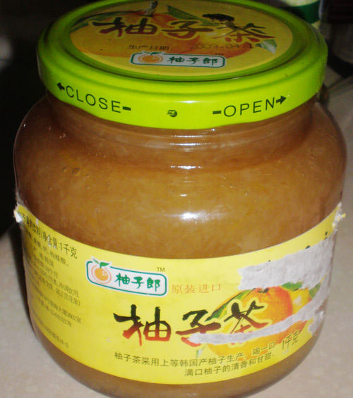 我喜欢喝柚子茶,喜欢它那甜中带苦、而且散发着柚子的清香的味道。长期喝柚子茶可以美白祛斑,排毒养颜,柚子皮还具有祛痰镇咳的功效。可超市里卖的柚子茶太贵了。我这装柚子茶的瓶子就是几年前买的,就这么一瓶柚子茶,五六十元。这也太贵了,不过确实好喝。为了既能喝上美味的柚子茶又能省钱,咱只好自制柚子茶了。