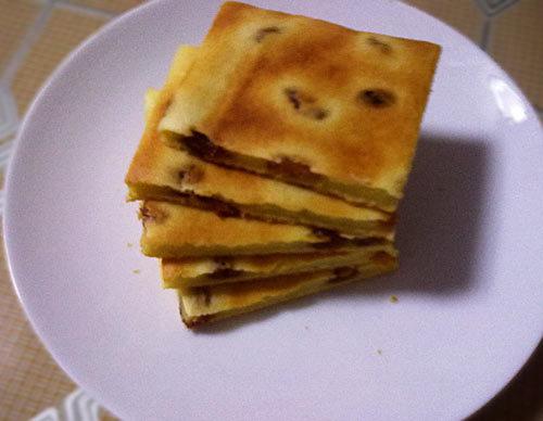 因为从冷冻拿出的黄油还余一点,不值得再冻起来。于是就做了这道小点心,浓浓的蛋奶味,特别好吃。又因为最近老做戚风蛋糕,所以这次就没再打发蛋清,做了一个薄饼。味道很好!