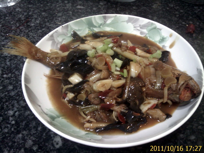 及以下步骤:3到5分钟后,先把鱼盛出来。把水淀粉倒入底汤中,略翻搅和大火收汁。浓厚倒在鱼身上,撒上小葱花就可以了。 这个大眼鱼很好煎。只煎一条是因为只做一个人的饭。 同时备料。黑木耳泡发切丝,猪肉丝,蒜瓣,大葱末,姜丝,小葱末,干辣椒,豆瓣酱。其他料要有点陈醋、糖和料酒、淀粉。 这个大眼鱼很好煎。只煎一条是因为只做一个人的饭。 同时备料。黑木耳泡发切丝,猪肉丝,蒜瓣,大葱末,姜丝,小葱末,干辣椒,豆瓣酱。其他料要有点陈醋、糖和料酒、淀粉。 鱼煎成这样就可以了。 把鱼盛出来。余油烧热。先放入猪肉丝煸炒至出水 放入姜丝、大葱、大蒜和干辣椒、豆瓣酱翻炒至出香味。 加入热水或热的高汤。然后把鱼和木耳放进去炖一下。加少许陈醋和料酒、白糖。 3到5分钟后,先把鱼盛出来。把水淀粉倒入底汤中,略翻搅和大火收汁。浓厚倒在鱼身上,撒上小葱花就可以了。