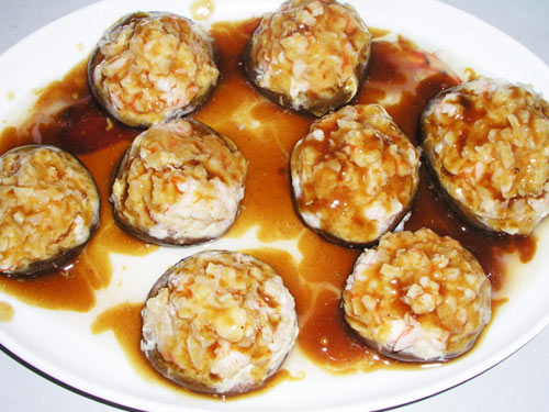 制作美食鲜虾香菇盏。