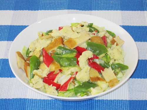 鸡蛋(2个) / 红辣椒(1个) / 青辣椒(1个) / 豆腐干(150克) / 圆包菜(400克)