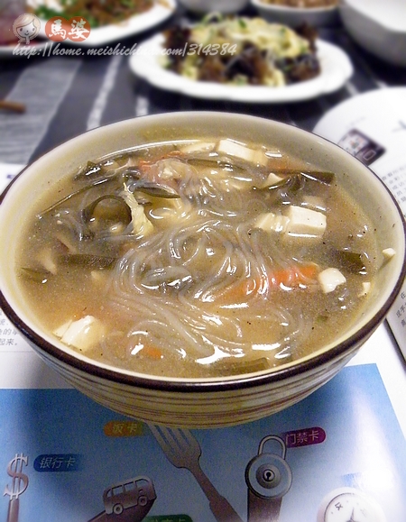 及以下步骤:放入豆腐搅一下。 淀粉加适量水勾芡。 锅再一次烧开,淋入芡汁。 煮约5分钟后,加盐,白醋,胡椒粉调味。停火后淋香油。 烧水的过程将内酯豆腐切粗条,不用切很细,在锅内搅拌豆腐会继续碎。 锅开后放入粉丝,海带丝和胡萝卜丝。 放入豆腐搅一下。 淀粉加适量水勾芡。 锅再一次烧开,淋入芡汁。 煮约5分钟后,加盐,白醋,胡椒粉调味。停火后淋香油。