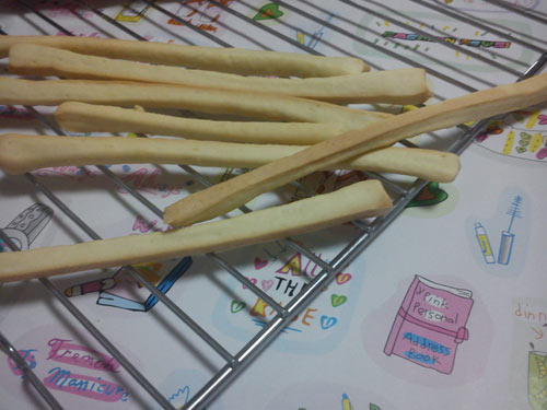 7、将小细条拉长,摆入烤盘。