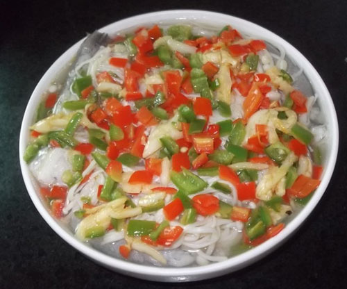 及以下步骤:蒸好的鱼,倒去多余的汤水。 青红辣椒切碎粒,蒜头拍碎。 热油锅放点盐爆香蒜头。 青红椒粒炒熟。 铺在蒸好的鱼上面,菜做好了。 蒸好的鱼,倒去多余的汤水。 青红辣椒切碎粒,蒜头拍碎。 热油锅放点盐爆香蒜头。 青红椒粒炒熟。 铺在蒸好的鱼上面,菜做好了。