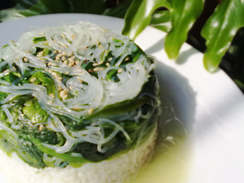 及以下步骤:菠菜洗净从中间切断,锅里放水,滴几滴油,先放菠菜梗焯一会。 再放叶,焯熟捞出备用,再把粉丝煮软。 菠菜洗净从中间切断,锅里放水,滴几滴油,先放菠菜梗焯一会。 再放叶,焯熟捞出备用,再把粉丝煮软。 菠菜洗净从中间切断,锅里放水,滴几滴油,先放菠菜梗焯一会。 再放叶,焯熟捞出备用,再把粉丝煮软。 菠菜趁热放盐搅拌均匀,放鸡粉、醋、芥末搅拌均匀。 放香油、粉丝搅拌均匀。 把拌好的菠菜放到碗里,压实,再放米饭压实。 倒扣出来,撒上熟芝麻,浇上拌菜的汤汁。ok!