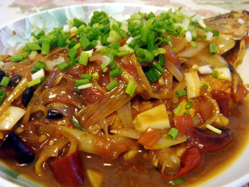 料酒(适量) / 小葱(适量) / 白糖(适量) / 生抽(适量) / 淀粉(适量) / 番茄(一个) / 姜丝(适量) / 大葱(一小段) / 干辣椒(适量) / 花生油(适量) / 陈醋(适量) / 大蒜(适量) / 豆豉(适量) / 小磨香油(适量)