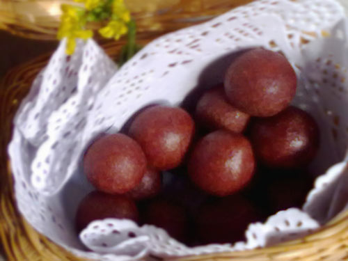 7、6成热时放丸子,这时转动锅子,让丸子均匀受热,同时用大勺把热油浇在丸子上,炸至紫红色出锅。
