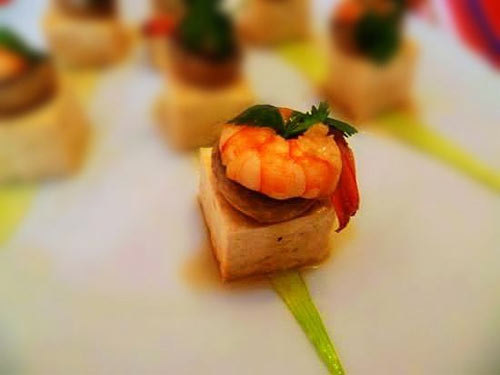 7、装盘时将豆腐整齐地码放盘中,每块豆腐上放一个口菇和一个虾仁,将芡汁浇淋菜上即可