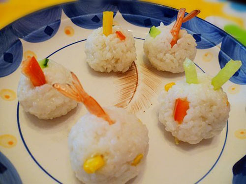 4、洗干净手,把处理好的米饭捏成饭团,圆形,当然你也可以发挥你的想象,三角形,方形均可,插上黄瓜条和大虾即可