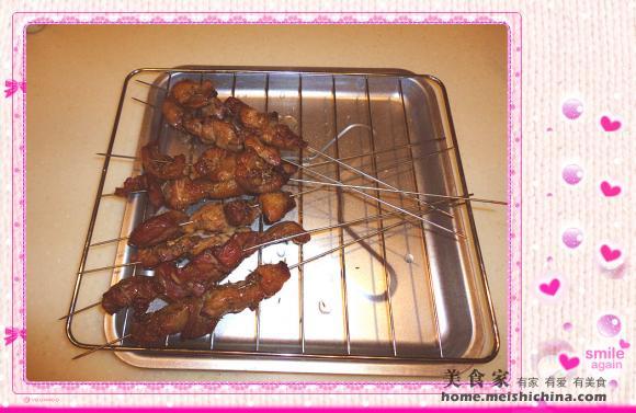 4、烤箱180度预热5分钟,把串好的肉串上撒上孜然粒放入烤箱中,180度上下火10分钟。