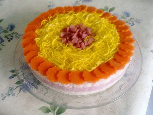 超级简单,超级喜喜欢! 女儿过生日,这是我亲手为她做的第一个生日蛋糕,很有纪念意义的! 女儿早上起床的时候,我正好放蛋丝,她看见非常惊讶,妈妈,这是什么呀,好漂亮呀,先吃一口吧?蛋糕吗?怎么是米饭做的呀?还有粉红色?这是怎么做出来的呀、、、呵呵,一连串的问号。 祝女儿生日快乐!