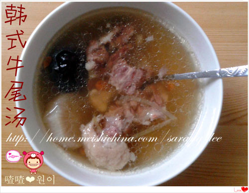 韩式牛尾汤(소꼬리탕),味道清淡厚道,润肺补肾,泽肌悦面,对强身健体有很神奇的作用,是一道非常有营养价值的汤。因牛尾富含胶原蛋白,可以补充体能并且补充体内的氨基酸和蛋白质,对青少年的身体发育有很好的促进作用,同时也是病人恢复期的营养品。汤里的枸杞子具有补肾益精,提升肌体免疫力的作用,而大枣具有益气、养血、安神、补益脾胃、增强耐力的作用,是寒秋里不可多得的养身汤。 原本牛尾汤是要汤锅煲上一天的,我这里改良了一下,用的电压力锅,熬了有两个半小时,最后牛尾上的肉都软烂脱骨了~~大概是因为有大枣跟枸杞的原因,汤色偏清,并非汤色发白。熬汤的时候也并没有加任何调味料,只是在喝的时候,按自己口味,自行添加适量盐、黑胡椒、辣椒粉。